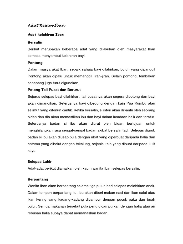 • si ibu akan menggariskan kapur pd tiang dinding rumah utk menghitung hari kelahiran • wanita iban perlu menjalani amalan. Adat resam kaum iban secara tradisi kehidupan masyarakat iban diatur oleh adat mereka yang amat rapat berkait dengan sostem pertanian berhuma (bumai) padi. Dalam kehidupan masyarakat bajau adat resam yang berkaitan dengan kelahiran amat dititik beratkan. Walau bagaimanapun, tidak semua masyarakat iban moden yang melupakan tentang perihal kebudayaan asal dan juga adat istiadat malah ada yang masih mengamalkannya juga. Adat perkahwinan orang iban di sarawak betangkai lalu berisi.